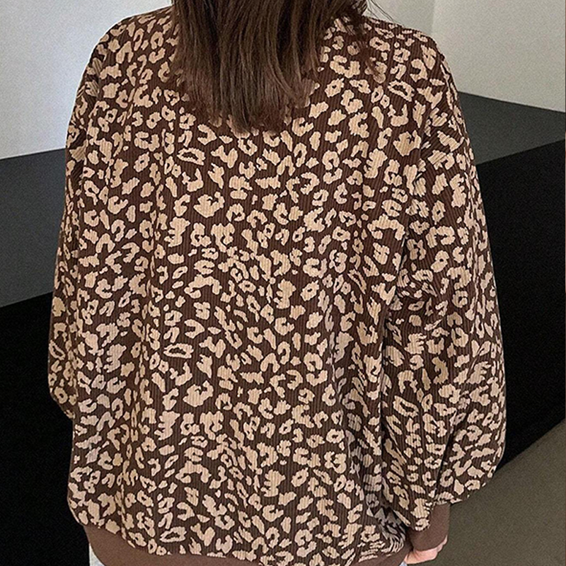 UTMÄRKANDE LEOPARDMÖNSTER: Detta plagg har ett modernt leopardmönster som ger ett djärvt visuellt intryck. Mönstret är jämnt fördelat över tyget, vilket ger en iögonfallande estetik. Designen förstärker plaggets stil, vilket gör det lämpligt för olika casual-tillfällen och ett unikt tillskott till alla moderna garderober.