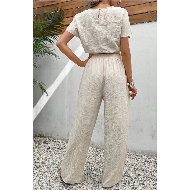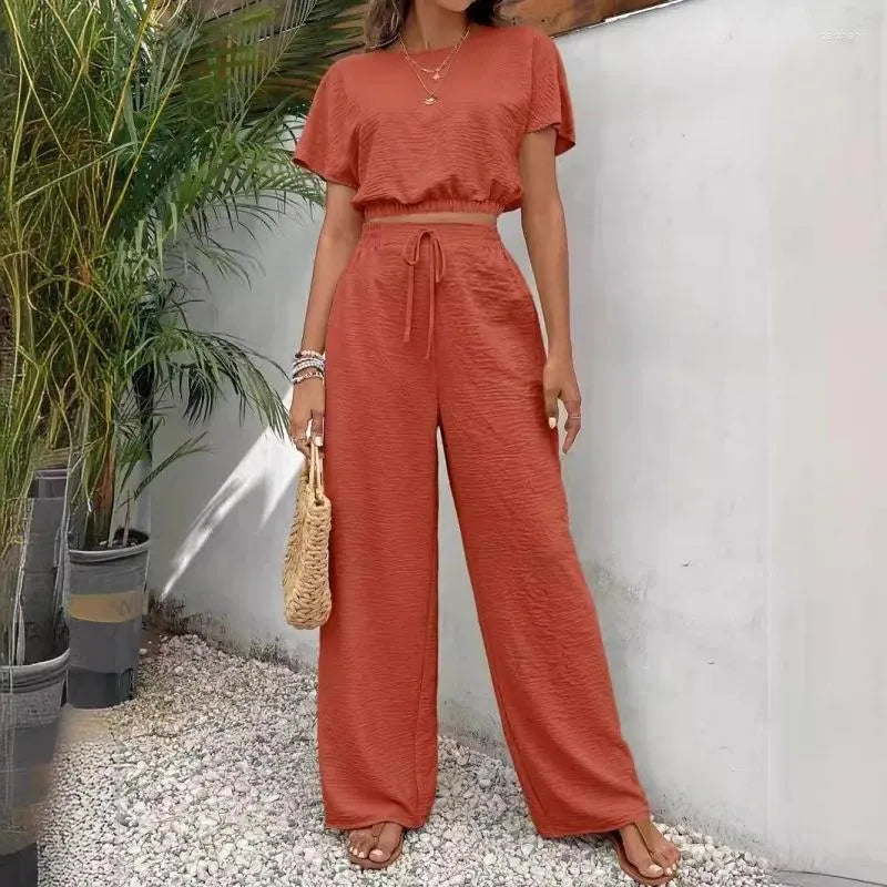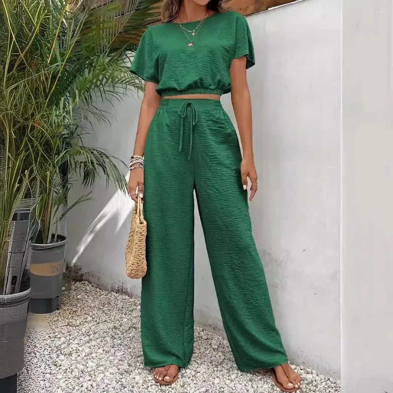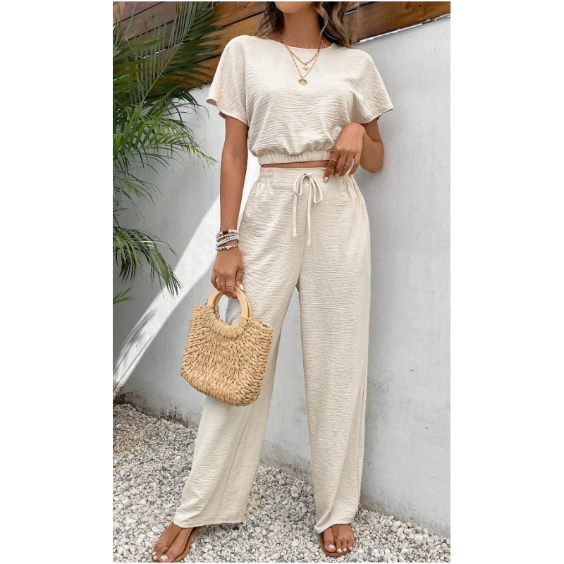 Tvådelat set för damer med kortärmad topp och raka byxor med vid be