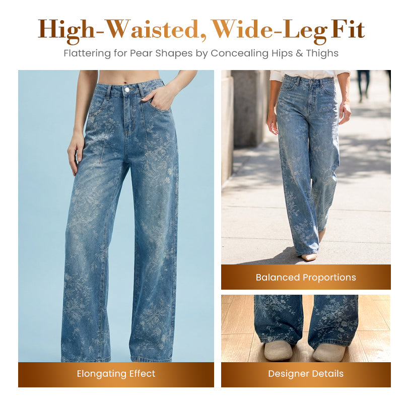 I paketet ingår: 1/2 * Dambyxor i denim med breda ben och blommönstrad jacquard