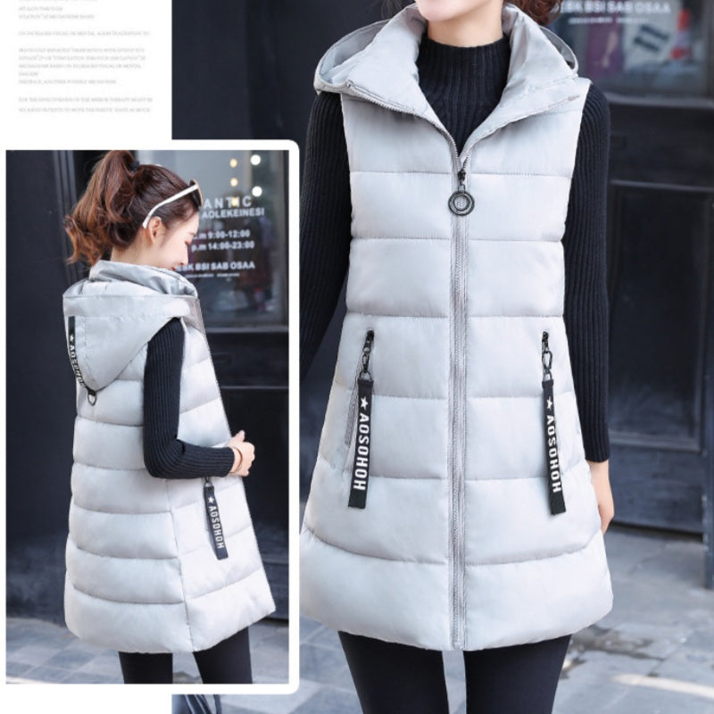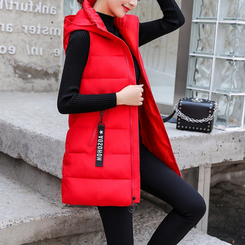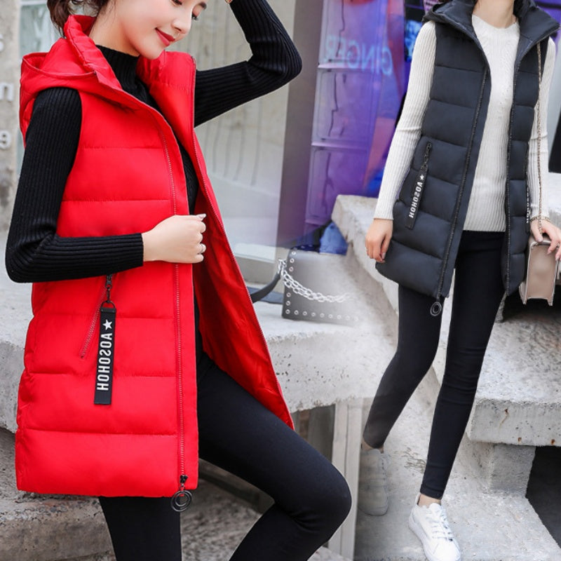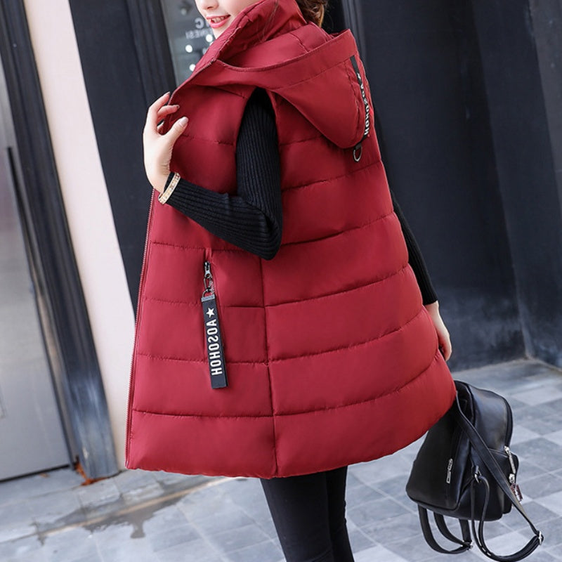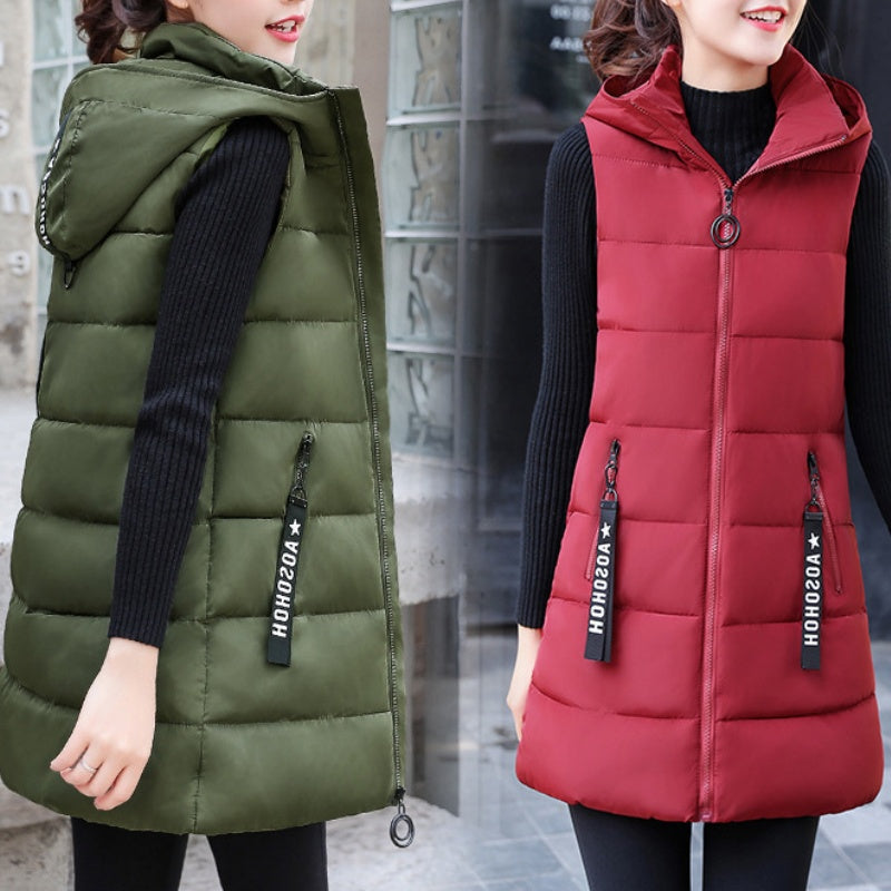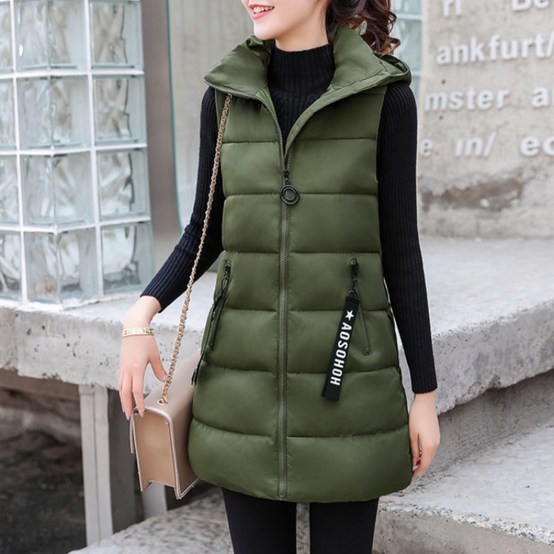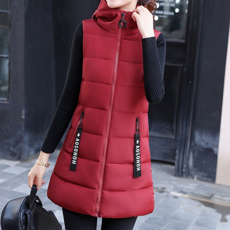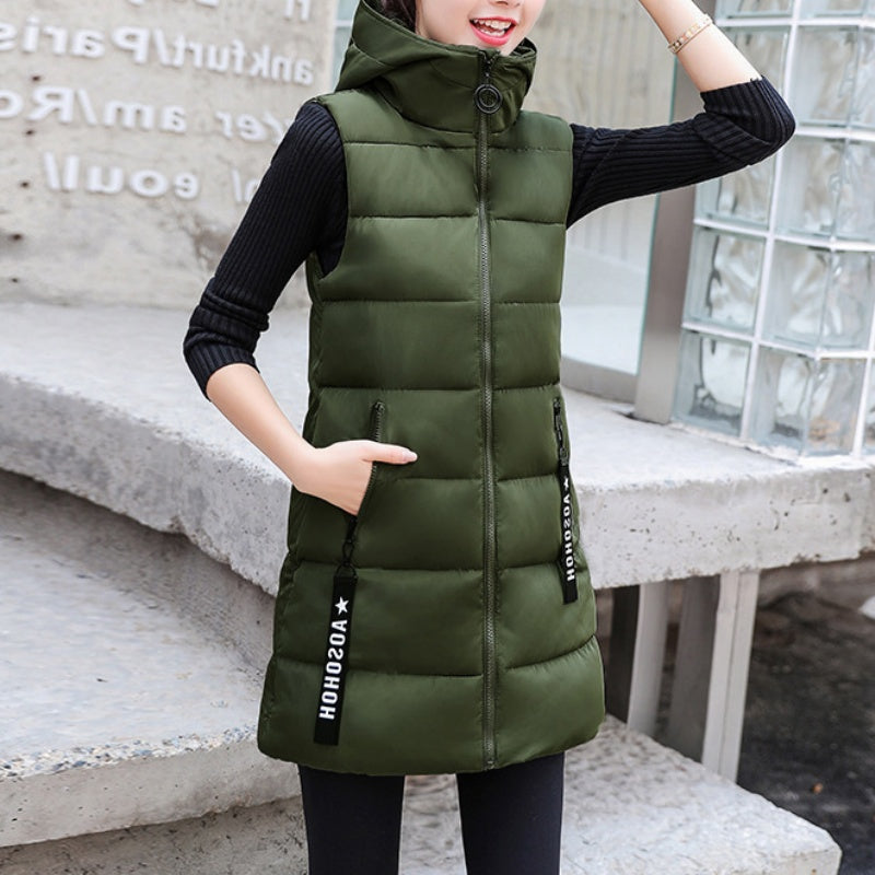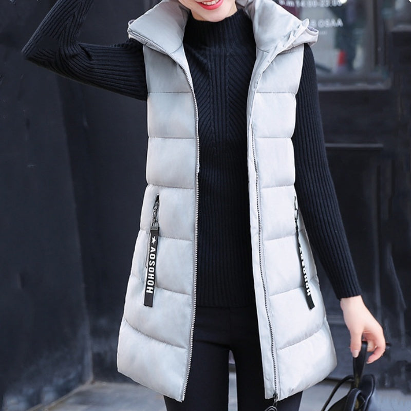 Damväst med dragkedja och vadderad bomull, lång och ärmlös