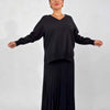 ELEGANT TWO-PIECE DESIGN - Detta set med stickad topp och plisserad kjol kombinerar sofistikering och komfort i en koordinerad outfit. V-ringningen framhäver din halsringning, medan den mjuka stickade strukturen kompletterar den flödande plisserade kjolen, vilket skapar en tidlös silhuett som är perfekt för avslappnade dagar eller raffinerade tillfällen.